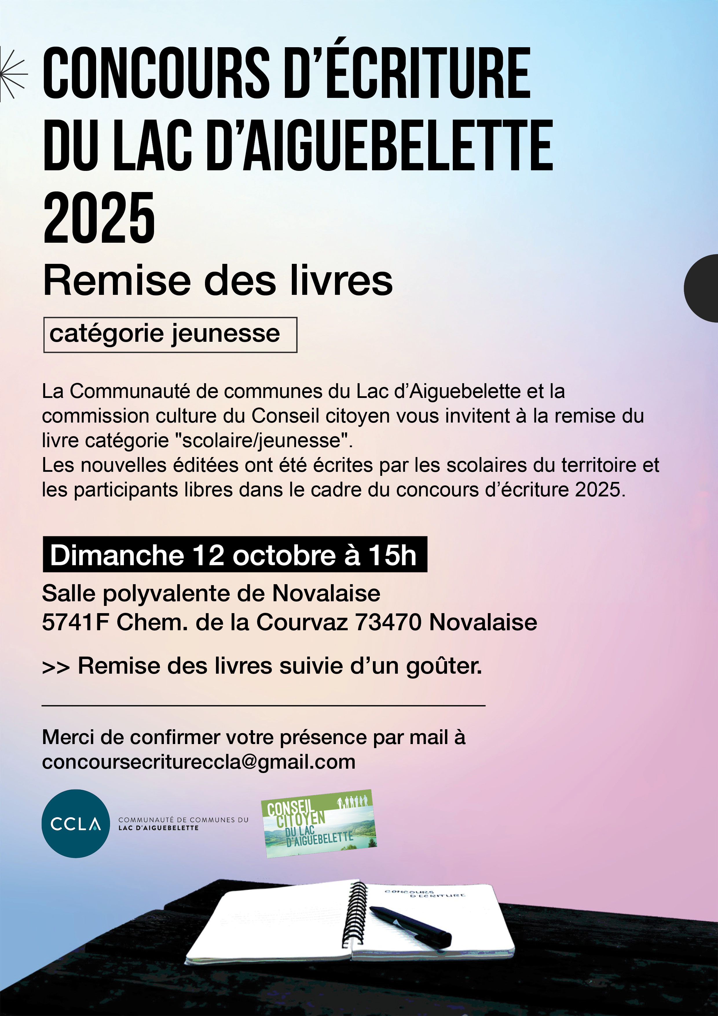 La CCLA invite tous les élèves ayant participé au concours de nouvelles l'an dernier ainsi que leur famille à se rendre la cérémonie de remise du livre souvenir le dimanche 12 octobre à la salle polyvalente de Novalaise dès 15 heures. Voir affiche ci-jointe.